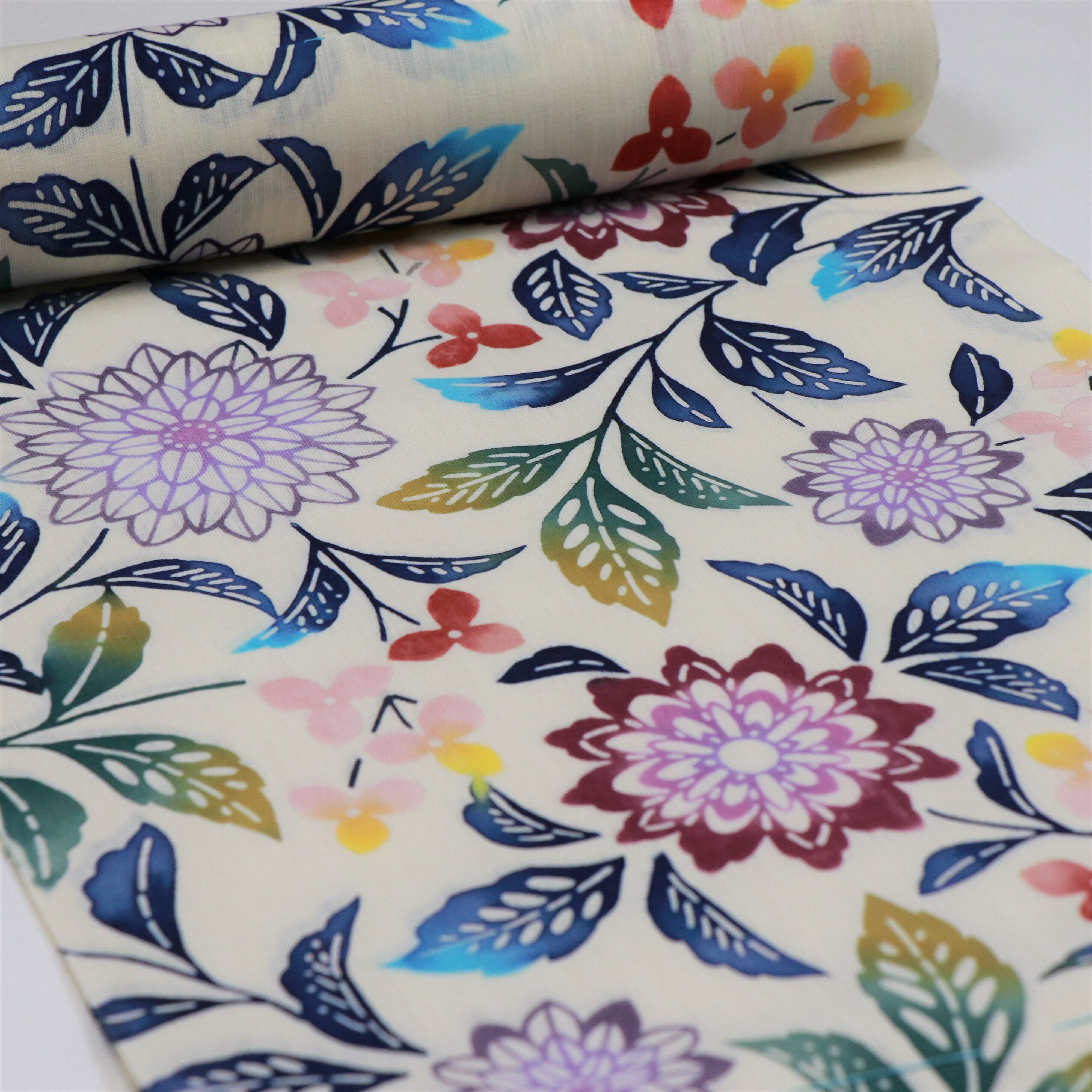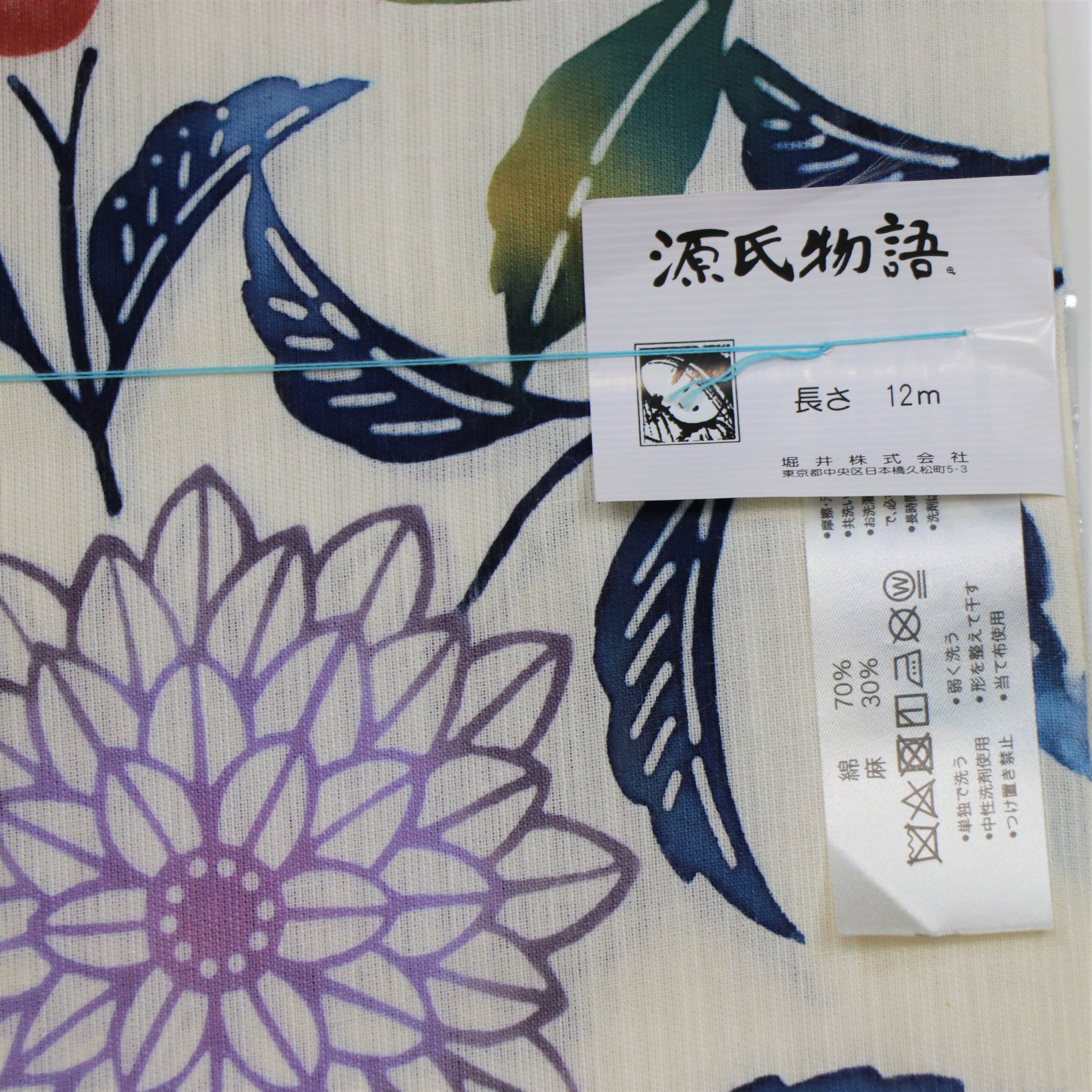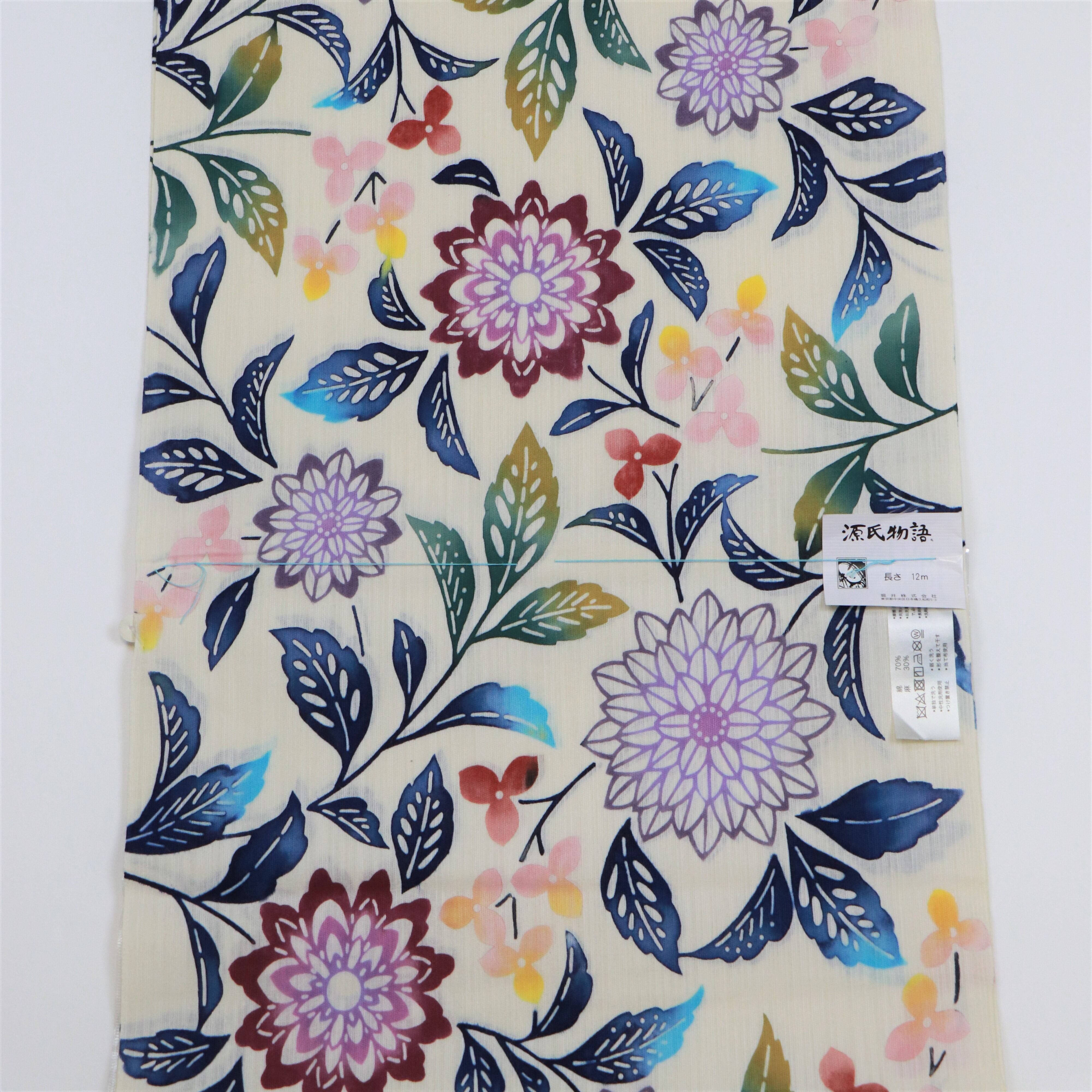 源氏物語 紅型調のゆかたです。 ゆかたとしてだけでなく、半衿を付け帯締めをして夏のきものとしてもOKです。 麻30% 綿70% 長さ12m